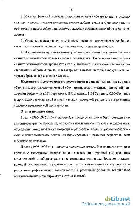 9 III этап (1998-2000 гг.) - обобщающий. Проведен качественный и количественный анализ полученных результатов, выявлены тенденции в проявлении и развитии рефлексивных возможностей в различных условиях. Определены функции рефлексии в механизме трансформации ценностно-смысловых составляющих образа мира человека.