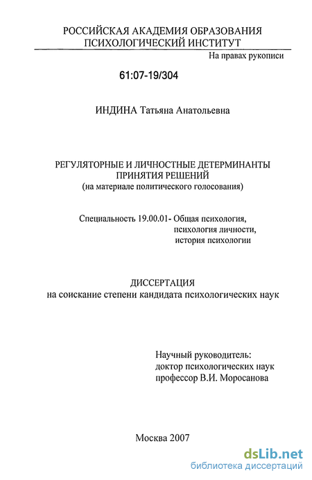 Методы исследования: психодиагностические методики для оценки регуляториых, личностных и когнитивных характеристик испытуемых: опросник «Стандартные прогрессивные матрицы» Равена (2002), опросник «Личностные факторы принятия решений» Т.В. Корниловой (2003), «Личностно-типологический индикатор» Д. Кейрси (2003), самооценочный тест «Характеристики эмоциональности» Е.П. Ильина (2000), опросник «Индивидуальный стиль саморегуляции поведения» В.И. Моросановой (2004), авторская экспериментальная модель «Политическое голосование» с последующим контент-анализом и экспертным оцениванием письменных самоотчетов испытуемых, а также методы корреляционного, факторного, кластерного, регрессионного анализа сгаїистических пакетов Statistica-б и SPSS-13.