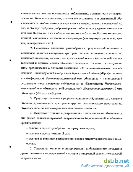 4 отечественной психологии, однако за пределами исследований до сих пор остаются вопросы субъективного содержания обмана, его смысловых детерминант, особенности субъективной семантики обмана и ее зависимости от социально-нравственной направленности личности. Несмотря на ряд исследований по проблемам лжи и обмана, как в отечественной - дореволюционной (Але-шинцев И.А., Преображенский CO., Шеталова А., Нечаев А.П. и др.) и современной (Дубровский Б.И., Душина Е.А., Знаков В.В., Щербатых Ю.К., Секац-кий А.К.), так и в зарубежной психологии (А.Адам, Л. Мелитан, В.Штерн, S. Bok, A. Vrij), имплицитные теории личности о лжи и обмане не являлись предметом научно-психологического анализа. Между тем, важность их реконструкции заключается в возможности выявления основных детерминант и регуляторов честного или обманного поведения.