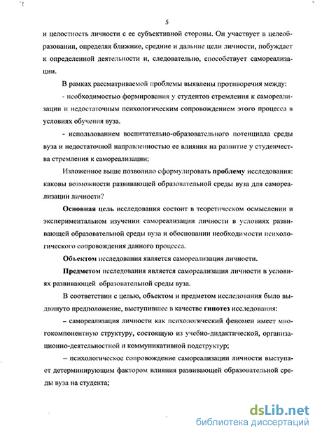 Предметом исследования является самореализация личности условиях развивающей образовательной среды вуза.