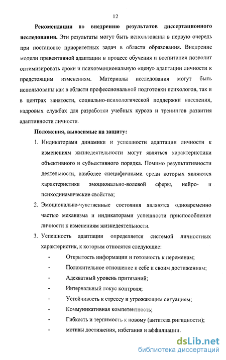 Рекомендации по внедрению результатов диссертационного исследования. Эти результаты могут быть использованы в первую очередь при постановке приоритетных задач в области образования. Внедрение модели превентивной адаптации в процесс обучения и воспитания позволит оптимизировать сроки и психоэмоциональную «цену» адаптации личности к предстоящим изменениям. Материалы исследования могут быть использованы как в области профессиональной подготовки психологов, так и в центрах занятости, социально-психологической поддержки населения, кадровых службах для разработки учебных курсов и тренингов развития адаптивности личности.
