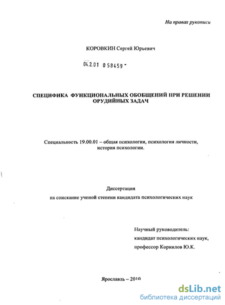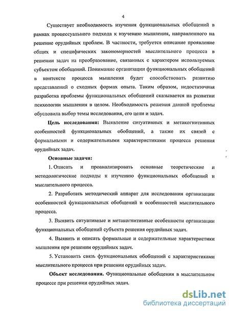 Предмет исследования. Особенности функциональных обобщений при решении орудийных задач, а также их связь с процессуальными и содержательными характеристиками мыслительного процесса.