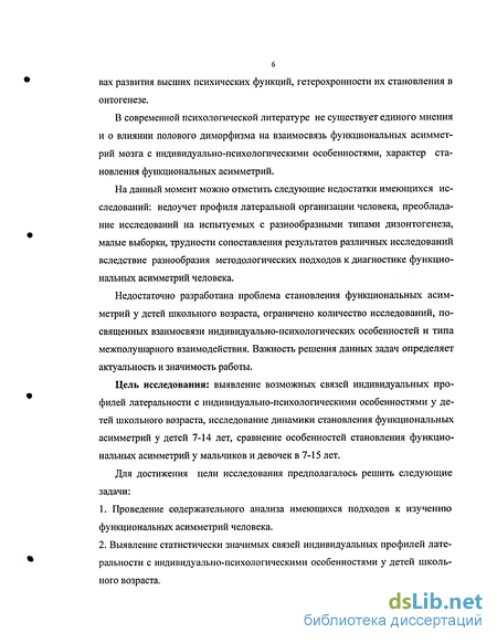 Предмет исследования: различия в индивидуально-психологических особенностях детей, обусловленные типами индивидуальных профилей латераль-ности, изменения в структуре латеральных признаков детей как проявление становления функциональных асимметрий в 7-15 лет.