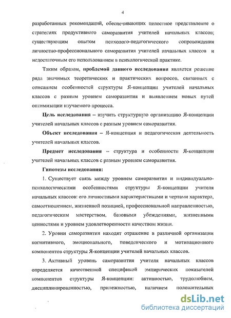 Кроме этого, необходимость изучения Я-концепции учителей начальных классов с разным уровнем саморазвития усиливают существующие в системе современного образования противоречия между: потребностями общества в учителях, обладающих высоким уровнем саморазвития, и отсутствием научно разработанных рекомендаций, обеспечивающих целостное представление о стратегиях продуктивного саморазвития учителей начальных классов; существующим опытом психолого-педагогического сопровождения личностно-профессионального саморазвития учителей начальных классов и недостаточным его использованием в психологической практике.