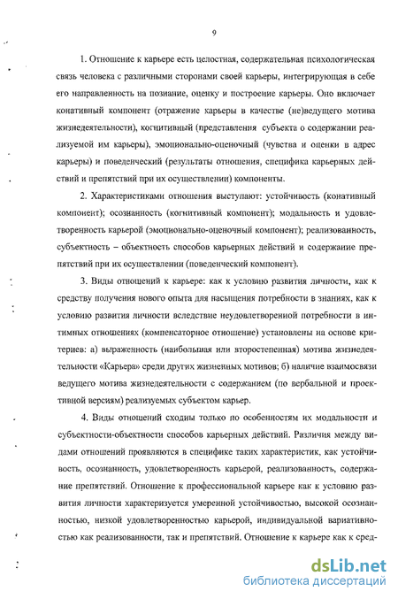 Мясищев В.Н., Сарджвеладзе Н.И./, характеристиках, видах отношений и критериях их выделения /Абульханова-Славская К.А., Гозман Л .Я., Джанерь- ян С.Т., Лазурский А.Ф., Ломов Б.Ф., Мясищев В.Н., Сарджвеладзе Н.И., Сталин В.В., Шкурко Т.А./; представления о ценностях в их связи с мотивацион- но-потребностной сферой личности /Братусь Б.С., Василюк Ф.Е., Гудечек Я., Джанерьян С.Т., Жуков Ю.М., Леонтьев Д.А., Тихомандрицкая О.А./; психологические представления о профессиональной карьере /Джанерьян С.Т., Маркова А.К., Лотова И.П., Стамбулова Н.Б./, о типологиях карьер и критериях их выделения /Джанерьян С.Т., Лотова И. П., Стамбулова Н.Б., Сьюпер Д./; положения о развитии отношений личности к профессиональной карьере в связи с развитием профессионального самосознания /Джанерьян С.Т., Маркова А.К., Фонарёв А.Р./; результаты эмпирических исследований взаимосвязей феноменов карьеры и индивидуально-психологических особенностей личности /Авто- номова С,А., Афанасенко И.В., Берн Ш., Зайцева Л.А., Козиевская Е.В., Ожигова Л.Н., Трофимова Е.В., Хвостов А.А., Шевелёва A.M. и др./.