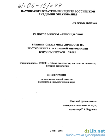 проработанность указанной проблемы определили выбор темы исследования - «Влияние образа мира личности на ее отношение к рекламной информации в экономической сфере».