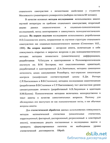 В качестве основных методов исследования использовались: анализ научной литературы по проблеме социального самочувствия; вторичный анализ данных социологических и социально-психологических исследований; метод анкетирования и совокупность психодиагностических методик. На первом подэтапе исследования использовалась разработанная Н.Е.Симоновичем анкета, направленная на изучение структуры социального самочувствия как социально-психологического явления (Симонович Н.Е., 1999). На втором подэтапе - авторская анкета, включающая в себя совокупность открытых и закрытых вопросов и ряд психодиагностических методик: методика личностного (семантического) дифференциала, разработанная Ч.Осгудом и адаптированная в Психоневрологическом институте им. В.М. Бехтерева; тест смысложизненных ориентации, разработанный и адаптированный Д.А.Леонтьевым; методика самооценки интеллекта; шкала самоуважения Розенберга; тест-опросник локализации контроля (модификация соответствующей шкалы Е.Дж. Роттера СР.Пантелеевым и В.В.Столиным); методика исследования самоотношения (разработанная В.В.Столиным и С.Р.Пантилеевым); тест диагностики уровня самоактуализации личности (разработанный А.В.Лазукиным в адаптации Н.Ф.Калина). Психологические методики включались непосредственно в текст анкеты в качестве самостоятельных вопросов. Поэтому для обследуемых они выступали не как психологические тесты, а как обычные вопросы анкеты.