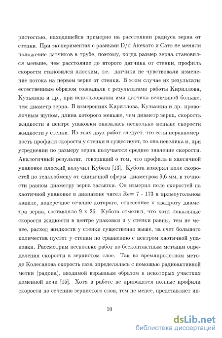 работ противоречивы. Частично это связано с известными недостатками контактной методики такими, как искажение пористой среды и потока, зависимость показания датчиков от расстояния до твердой поверхности шариков или стенки канала, сложность в определенш вектора локальной скорости потока. С другой стороны, возможно к влияние вида упаковки, геометрии рабочего участка, режима течение жидкости. Так, например, Миклей с сотрудниками изучали поле скоростей на правильной упаковке при достаточно высоких числах R< > 4500, т.е. в турбулентной области, где они нашли, что локальна* скорость вблизи стенки на 10% выше скорости в центре. Кириллов Кузьмин и др. изучали поле скоростей в хаотичных упаковках прі числах Re < 600, а Акехато, Сато и Кубота при числах,Re < 200, т.е ближе к ламинарному течению, и получили плоский или почти плос кий профиль локальной скорости. Эти результаты не согласуются < результатами Каринса, Праузнитца, которые практически для всеп диапазона чисел Re= 9 - 1700 получили скорость у стенки на 20% вы ше скорости в центре упаковки, и противоречат результатам Ван де] Мерве, Гаувина, у которых с повышением числа Re профиль скорості становится более крутым.