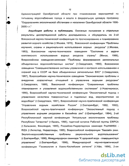 Апробация работы и публикации. Основные положения и отдельные результаты диссертационной работы докладывались и обсуждались на 2-ой Всесоюзной научно-технической конференции по прогнозированию и планированию развития водного хозяйства (г.Москва, 1978), Всесоюзной конференции "Проблемы изучения, охраны и рационального использования еодных ресурсов" (г.Москва, 1983), Всесоюзном научно-техническом совещании "Состояние и задачи комплексного использования водных ресурсов страны" (Минск, 1986), Всероссийском совещании-семинаре "Проблемы формирования региональных объединенных водохозяйственных систем" (г.Свердловск, 1985), Всесоюзном совещании "Совершенствование системы управления и контроля использованием и охраной вод в СССР на базе объединенных региональных ВХС" (г.Свердловск, 1987), Всероссийском научно-техническом совещании "Экономические проблемы и внедрение хозрасчетных отношений в управление водными ресурсами" (г.Свердловск, 1989), Всесоюзной конференции "Современные проблемы планирования и управления водохозяйственными системами" (г.Новочеркасск, 1990), Всероссийской научно-технической конференции "Экосистемный подход к управлению качеством поверхностных и подземных вод, мероприятиями на водосборе" (г.Свердловск, 1991), Всероссийской научно-практической конференции "Управление водным хозяйством России" (г.Екатеринбург, 1992, 1993), Всероссийской научно-практической конференции "Экосистемный подход к управлению водными ресурсами в бассейнах рек" (г.Екатеринбург, 1994), 2-ой Республиканской научной конференции "Актуальные экологические проблемы Республики Татарстан" (г.Казань, 1995), годичной встрече Рабочей группы EWPCA (г.Хельсинки, Финляндия, 1995), Российско-Нидерладском семинаре РосНИИВХ -RIZA (г.Лилестад, Нидерланды, 1995), Всероссийской конференции "Бассейн реки. Эколого-водохозяйственные проблемы рационального водопользования" (г.Екатеринбург, 1996), Международном семинаре "К здоровой воде - совершенствуя управление" (г.Екатеринбург, 1996), Международной научно-практической конференции "Геоэкология в Урало-Каспийском регионе" (г.Уфа, 1996), 2-ом Международном конгрессе "Вода: экология и технология" (г.Москва, 1996), 3-ей Международной выставке-семинаре "Чистая вода Урала-96" (г.Екатеринбург, 1996), Всероссийской научно-практической конференции "Управление устойчивым водопользованием" (г.Москва, 1997), других областных конференциях и совещаниях, а также на ВДНХ РФ, где экспонаты результатов научных работ диссертанта получили серебрянные медали в 1992, 1993 гг.. Результаты исследований опубликованы в 70 печатных работах.