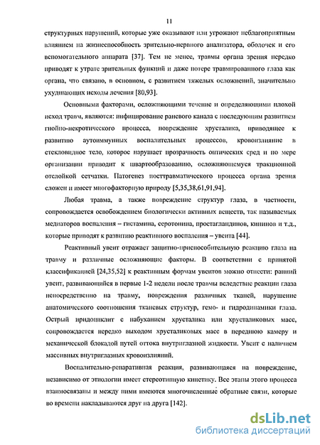 В изучении патогенеза травмы глаза достигнуты значительные успехи благодаря комплексным клиническим, иммунологическим [Л.Т.Архипова, 1967-2001гг., Е.И.Волик, 2002г. и др.], биохимическим [Е.К.Бенделик, 1998г., Г.А.Винькова, 1996г., Т.Н.Киселева, 1995г. и др.] и морфологическим [И.П.Хорошилова-Маслова, 1978-1998гг., Е.Н.Вериго, 1989г. и др.] исследованиям, в результате которых определены некоторые закономерности течения раневого процесса и разработаны схемы патогенетического лечения.