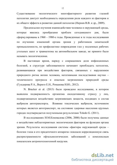 В настоящее время, наряду с сокращением доли инфекционных болезней, в структуре заболеваемости начинают преобладать патологии, развивающиеся при воздействии факторов, связанных с нарушением природного ритма жизни человека, негативными последствиями научно – технического прогресса и опасным загрязнением природной среды (Гундорова Р.А., Вериго Е.Н., Романова И.Ю., 2012). N. Brucker et al. (2013) было проведено исследование, в котором выявлена подверженность организма оксидативному стрессу у лиц, подвергающихся воздействию загрязняющих веществ, входящих в состав выбросов автотранспорта. Влияние токсических выбросов, источником которых является автотранспорт, на состояние здоровья населения крупных городах подтверждается полученными результатами Toledo G. (2011). В исследованиях И.М.Коновалова (2006, 2008) были получены данные о воздействии неблагоприятных экологических факторов на функции органа зрения. Результаты исследования системы «факторы окружающей среды – болезни глаза и его придаточного аппарата» показали корреляционную связь распространенности офтальмологических заболеваний с комплексным показателем антропотехногенной нагрузки. Bourcier T. (2003) была определена взаимосвязь частоты обращений к офтальмологу и уровня загрязнения атмосферного воздуха и климатических условий.