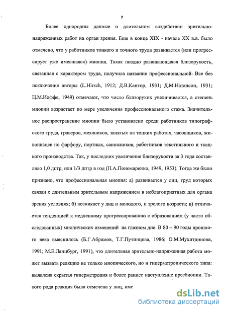 Более однородны данные о длительном воздействии зрительно- напряженных работ на орган зрения. Еще в конце XIX - начале XX в.в. было отмечено, что у работников тонкого и точного труда развивается (или прогрессирует уже имевшаяся)-миопия. Такая поздно развивающаяся близорукость, связанная с характером труда, получила название профессиональной: Все без исключения авторы (Ь.ШгбсЬ, 1912; Д.В.Кантор, 1931; Д.М.Натансон,- 1931; Ц.М.Иоффе, 1949) отмечают, что число близоруких увеличивается, а степень миопии возрастает по мере увеличения профессионального стажа. Значительное распространение миопии- было установлено среди работников типографского труда, граверов, механиков, занятых на тонких работах, часовщиков, живописцев по фарфору, портных, сапожников, работников текстильного и ткацкого производства. Так, у последних увеличение близорукости за 3 года составляло 1,0 дптр, или 1/3 дптр в год (П.А.Пономаренко, 1949, 1953). Тогда же было признано, что профессиональная миопия: а) развивается у лиц, труд которых связан с длительным зрительным напряжением в неблагоприятных для органа зрения условиях; б) возникает у лиц и молодого, и зрелого возраста; в) отличается тенденцией к медленному прогрессированию с образованием (у части обследованных) миопических изменений на глазном дне. В 80 - 90 годы прошлого века выяснилось (Б.Г.Абрамов, Т.Г.Путинцева, 1986; О.М.Мухитдинова, 1991; М.Е.Ланцбург, 1991), что длительная зрительно-напряженная работа может вызвать реакцию не только миопического, но и гиперметропического типа: выявлена скрытая гиперметропия и более раннее наступление пресбиопии. Такого рода реакция была отмечена у лиц, имевших гиперметропию в начале работы на зрительно-напряженном производстве, а также у многих работников старше 35 лет.