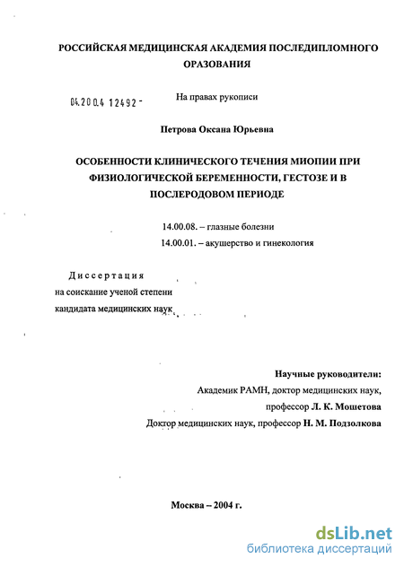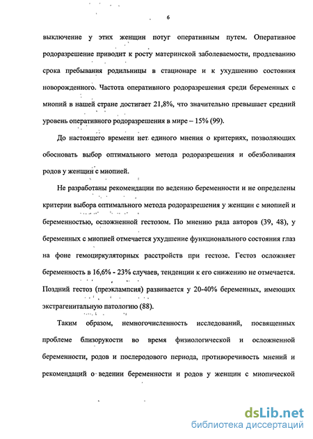 Таким образом, немногочисленность исследований, посвященных проблеме близорукости во время физиологической и осложненной беременности, родов и послеродового периода, противоречивость мнений и рекомендаций о* ведении беременности и родов у женщин с миопической