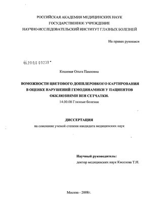 Таким образом, противоречивость данных зарубежной литературы о состоянии кровотока в сосудах глаза при окклюзии ретинальных вен и прогностической ценности метода ЦДК обуславливают необходимость дальнейшего поиска и разработки ультразвуковых критериев диагностики и прогноза окклюзионных поражений вен сетчатки. Кроме того, остаются недостаточно изученными вопросы взаимосвязи клинических проявлений окклюзии вен сетчатки и степени выраженности патологических изменений артерий каротидного бассейна. Не проводилось комплексное исследование регионарной (артериальной и венозной) гемодинамики и состояния магистральной гемоциркуляции.