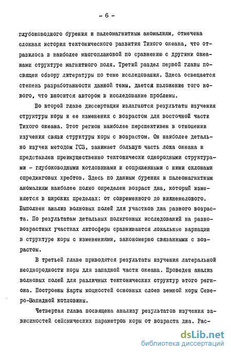 Диссертация состоит из четырех глав. В первой главе дается обзор геолого-физической изученности дна Тихого океана. Первый раздел главы посвящен истории работ методом ГСЗ. В хронологическом порядке перечислены экспедиции, изучавшие строение земной коры, дано краткое описание методики и результатов работ. Во втором разделе приводятся сведения о возрасте дна по данным глубоководного бурения и палеомагнитным аномалиям, отмечена сложная история тектонического развития Тихого океана, что отразилось в наиболее многоплановой по сравнению с другими океанами структуре магнитного поля. Третий раздел первой главы посвящен обзору литературы по теме исследования. Здесь освещается степень разработанности данной темы, дается изложение того нового, что вносится автором в исследование проблемы.