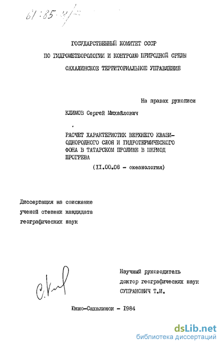 Результаты данной работы на разных стадиях ее выполнения неоднократно докладывались на промсовете п/о "Сахалинрыбпром". Сообщения по отдельным разделам работы заслушивались на 8-й и 9-й областных конференциях прогнозистов СахУГКС, а также на итоговой сессии Ученого Совета ДВНИЇЇ в 1981 году. Доклады по теме диссертации делались на 12-й и 13-й конференциях молодых ученых Сахалинского комплексного БИИ. По решению секции гидрофизики на 13-й конференции СахКНЙИ некоторые разделы диссерта цин включены в план работы до геме "Разрезы", посвященной исследованию энергетических характеристик дальневосточных морей.