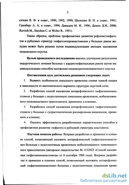 Научная новизна работы. Впервые разработан и применен в клинике способ, позволяющий наложить антирефлюксный ззофагоеюноаііастомоз больным с недостаточным кровотоком мобилизованного тонкокишечного трансплантата (авторское свидетельство № 1132923 «Способ наложения эзофагоеюноанастомоза» от 8 сентября 1984 года). Впервые разработан и применен в клинике способ, позволяющий наложить антирефлюксный эзофагоеюноанастомоз больным с недостаточным локальным кровотоком мобилизованного тонкокишечного трансплантата в сочетании с супрастенотическим расширенным пищеводом (Патент РФ № 2153296 «Способ наложения эзофагоеюноа-настомоза» от 20.12.1999).