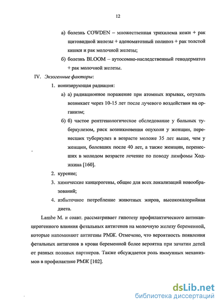 Факторы риска развития рака молочной железы. Факторы риска, приводящие к развитию рака молочной железы, в т.ч. долькового, делятся на эндогенные и экзогенные и классифицируются следующим образом (М. J. Greenall, В.Г. Иванов) [18]:
