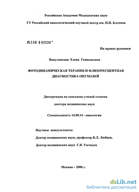 Вакуловская Елена Геннадьевна. Фотодинамическая терапия и флюоресцентная диагностика опухолей : диссертация ... доктора медицинских наук : 14.00.14 / Вакуловская Елена Геннадьевна; [Место защиты: ГУ "Российский онкологический научный центр РАМН"].- Москва, 2006.- 217 с.: ил.