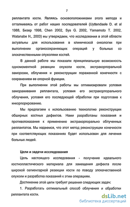 реплантата кости. Являясь основоположниками этого метода и отталкиваясь от работ наших последователей (Uyttendaele D. et al 1988, Бизер 1998, Chen 2002, Sys G. 2002, Yamamoto T. 2002, Watanabe H., 2003) мы утверждаем, что исследования в этой области актуальны для использования в клинической онкологии при выполнении органосохраняющих операций у больных со злокачественными опухолями костей.