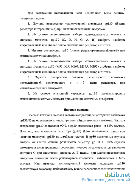 Как известно, клетки мантийноклеточной лимфомы характеризуются яркой экспрессией молекулы gp80, являющейся а-рецептором интерлейкина-6. Это послужило основанием полагать, что рецептор интерлейкин-6 может играть важное значение в патогенезе мантийноклеточной лимфомы. В ряде работ, показано, что клиническое значение может иметь структурно-функциональное состояние рецептора молекулы интерлейкина-6. Таким образом, на основании изучения структуры рецептора можно оценить состояние активации под действием цитокинов, или отсутствие таковой.