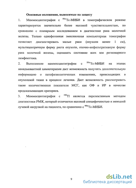 Доказана возможность применения маммосцинтиграфии с 99тТс-МИБИ у больных раком молочной железы в качестве дополнительного метода динамического наблюдения за опухолевой тканью в процессе неоадыовантной химиотерапии и для предсказания возможного ее эффекта, что позволяет планировать предоперационное лечение.