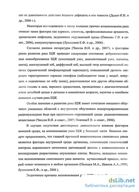 1.2. Этиопатогенез опухолей щитовидной железы По данным литературы возникновение новообразований ЩЖ определяется морфофункциональными особенностями организма и факторами окружающей среды (Зуев В.Г. и соавт., 2004; Павлова Т.В. и соавт, 2004). Причины, способствующие возникновению и развитию рака ЩЖ, принято разделять на две группы: экзогенные и эндогенные.