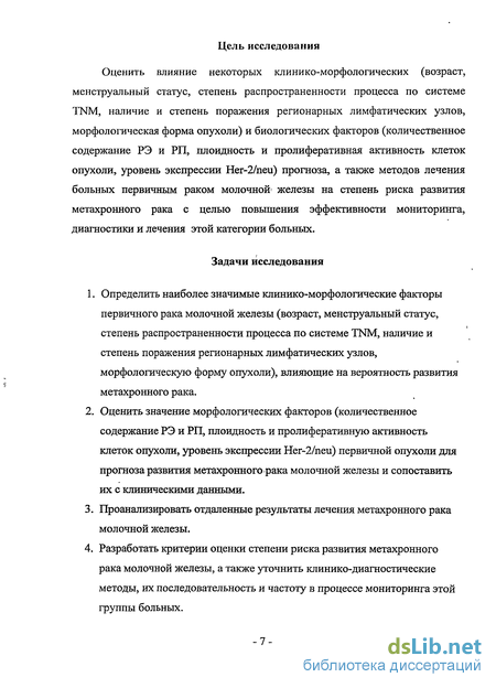 Оценить влияние некоторых клинико-морфологических (возраст, менструальный статус, степень распространенности процесса по системе TNM, наличие и степень поражения регионарных лимфатических узлов, морфологическая форма опухоли) и биологических факторов (количественное содержание РЭ и РП, плоидность и пролиферативная активность клеток опухоли, уровень экспрессии Her-2/neu) прогноза, а также методов лечения больных первичным раком молочной' железы на степень риска развития метахронного рака с целью повышения эффективности мониторинга, диагностики и лечения этой категории больных.