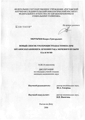 Мкртычев Капрел Григорьевич. Новый способ уретероцистанастомоза при органосохраняющем лечении рака мочевого пузыря T#32a-b#1N#30#1M#30#1 : диссертация ... кандидата медицинских наук : 14.00.14 / Мкртычев Капрел Григорьевич; [Место защиты: ФГУ "Ростовский научно-исследовательский онкологический институт"].- Ростов-на-Дону, 2006.- 0 с.: ил.