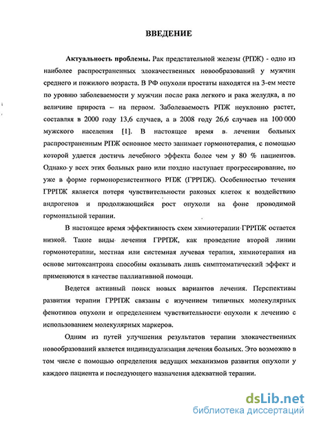 Рак предстательной железы (РПЖ) - одно из наиболее распространенных злокачественных новообразований у мужчин среднего и пожилого возраста. В РФ опухоли простаты находятся на 3-ем месте по уровню заболеваемости у мужчин после рака легкого и рака желудка, а по величине прироста - на первом. Заболеваемость РПЖ неуклонно растет, составляя в 2000 году 13,6 случаев, а в 2008 году 26,6 случаев на 100 000 мужского населения [Давыдов М.И., Аксель Е.М., 2010]. В настоящее время в лечении больных распространенным РПЖ основное место занимает гормонотерапия, с помощью которой удается достичь лечебного эффекта более чем у 80 % пациентов. Однако у всех этих больных рано или поздно наступает прогрессирование, но уже в форме гормонорезистентного РПЖ (ГРРПЖ). Особенностью течения ГРРПЖ является потеря чувствительности раковых клеток к воздействию андрогенов и продолжающийся рост опухоли на фоне проводимой гормональной терапии.