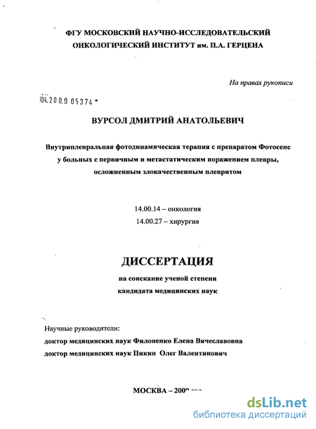 1) Разработать методику внутриплевральной фото динамической терапии с использованием фотосенсибилизатора «Фотосенс» при опухолевом поражении плевры, сопровождающимся злокачественным плевритом и определить показания к ней.