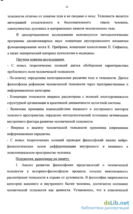 В ряду методологических положений, разработанных в философии и принятых диссертантом, находятся следующие: 1. Тело является первым пространством человека и природной основой для его становления. 2. Понятие телесности отлично от понятия тела и не сводимо к нему. Телесность является интеграцией сознательного и бессознательного опыта человека, совокупностью духовных и материальных качеств человеческого тела.