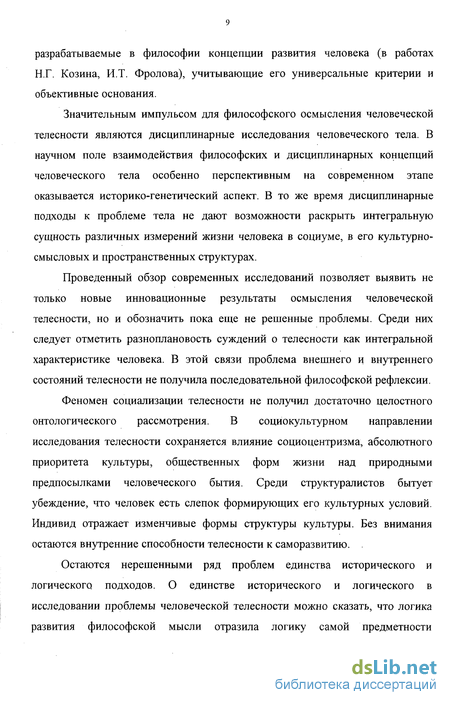 Значительным импульсом для философского осмысления человеческой телесности являются дисциплинарные исследования человеческого тела. В научном поле взаимодействия философских и дисциплинарных концепций человеческого тела особенно перспективным на современном этапе оказывается историко-генетический аспект. В то же время дисциплинарные подходы к проблеме тела не дают возможности раскрыть интегральную сущность различных измерений жизни человека в социуме, в его культурно-смысловых и пространственных структурах.