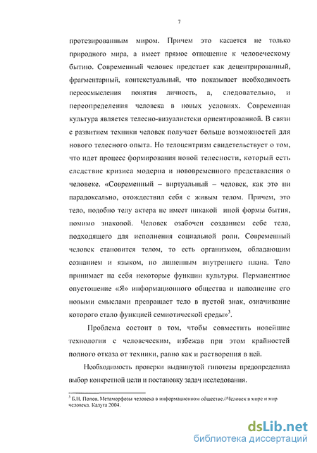протезированным миром. Причем это касается не только природного мира, а имеет прямое отношение к человеческому бытию. Современный человек предстает как децентрированный, фрагментарный, контекстуальный, что показывает необходимость переосмысления понятия личность, а, следовательно, и переопределения человека в новых условиях. Современная культура является телесно-визуалистски ориентированной. В связи с развитием техники человек получает больше возможностей для нового телесного опыта. Но телоцентризм свидетельствует о том, что идет процесс формирования новой телесности, который есть следствие кризиса модерна и нововременного представления о человеке. «Современный - виртуальный - человек, как это ни парадоксально, отождествил себя с живым телом. Причем, это тело, подобно телу актера не имеет никакой иной формы бытия, помимо знаковой. Человек озабочен созданием себе тела, подходящего для исполнения социальной роли. Современный человек становится телом, то есть организмом, обладающим сознанием и языком, но лишенным внутреннего плана. Тело принимает на себя некоторые функции культуры. Перманентное опустошение «Я» информационного общества и наполнение его новыми смыслами превращает тело в пустой знак, означивание которого стало функцией семиотической среды» .