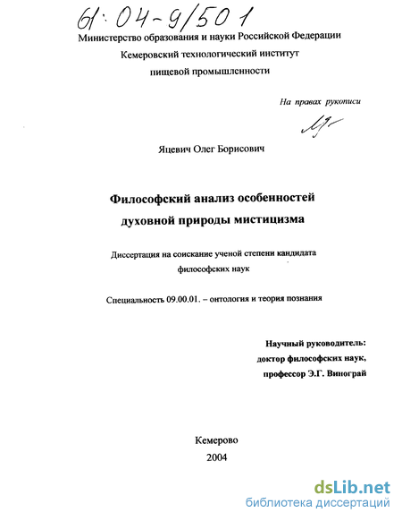 Степень разработанности проблемы. Феномен мистического в качестве особого объекта философского исследования начал привлекать к себе внимание в историко-философском плане примерно с середины ХГХ -начала XX века. Именно в этот период появляются работы Вильяма Джемса и Владимира Соловьева, посвященные исследованию различных аспектов мистического опыта, мистики и мистицизма. В частности, заслуживает внимания интерпретация В. Джемсом с позиций прагматизма аксиологической (смысложизненной) значимости мистического опыта и конституирования его равноценности в познавательном плане другим известным видам опыта. Следует отметить обоснование В. Соловьевым статуса мистицизма как одного из видов познания, причем наивысшего, наиболее совершенного по сравнению с другими, проведение дифференциации между мистикой и мистицизмом, а также рассмотрение