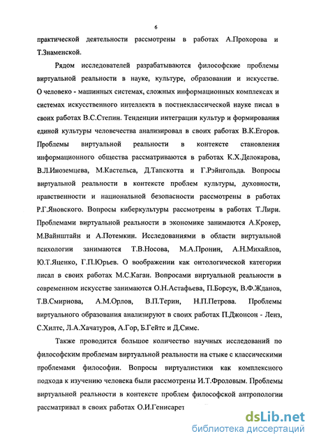 Рядом исследователей разрабатываются философские проблемы виртуальной реальности в науке, культуре, образовании и искусстве. О человеке - машинных системах, сложных информационных комплексах и системах искусственного интеллекта в постнеклассической науке писал в своих работах В.С.Степин. Тенденции интеграции культур и формирования единой культуры человечества анализировал в своих работах В.К.Егоров. Проблемы виртуальной реальности в контексте становления информационного общества рассматриваются в работах К.Х.Делокарова, В.Л.Иноземцева, М.Кастельса, Д.Тапскотта и Г.Рэйнгольда. Вопросы виртуальной реальности в контексте проблем культуры, духовности, нравственности и национальной безопасности рассмотрены в работах Р.Г.Яновского. Вопросы киберкультуры рассмотрены в работах Т.Лири. Проблемами виртуальной реальности в экономике занимаются А.Крокер, М.Вайнштайн и А.Потемкин. Исследованиями в области виртуальной психологии занимаются Т.В.Носова, М.А.Пронин, А.Н.Михайлов, Ю.Т.Яценко, Г.П.Юрьев. О воображении как онтологической категории писал в своих работах М.С.Каган. Вопросами виртуальной реальности в современном искусстве занимаются О.Н.Астафьева, П.Борсук, В.Ф.Жданов, Т.В.Смирнова, А.М.Орлов, В.П.Терин, Н.П.Петрова. Проблемы виртуального образования анализируют в своих работах П.Джонсон - Ленз, С.Хилтс, Л.А.Хачатуров, А.Гор, Б.Гейтс и Д.Симс.