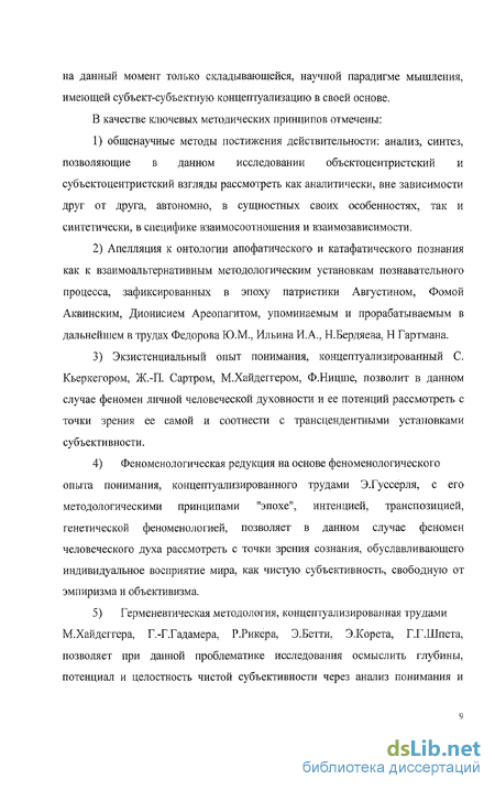 5) Герменевтическая методология, концептуализированная трудами М.Хайдеггера, Г.-Г.Гадамера, Р.Рикера, Э.Бетти, Э.Корета, Г.Г.Шпета, позволяет при данной проблематике исследования осмыслить глубины, потенциал и целостность чистой субъективности через анализ понимания и