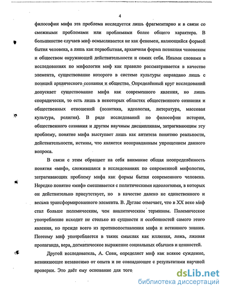 4 философии мифа эта проблема исследуется лишь фрагментарно и в связи со смежными проблемами или проблемами более общего характера. В большинстве случаев миф осмысливается не как феномен, являющийся формой бытия человека, а лишь как первобытная, архаичная форма познания человеком и обществом окружающей действительности и самих себя. Иными словами в исследованиях по мифологии миф как правило рассматривается в качестве элемента, существование которого в системе культуры оправдано лишь с позиций архаического.сознания,и общества.,Определённый круг исследований допускает существование мифа как современного явления, но лишь спорадически, то есть лишь в некоторых областях общественного сознания и общественных отношений (политика, идеология, литература, массовая культура, религия). В ряде исследований по философии истории, общественного сознания и другим научным дисциплинам, затрагивающим эту проблему, понятие мифа выступает лишь как антитеза понятию реальности, действительности, истины, что является неоправданным упрощением данного вопроса.