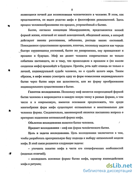 ^ Теоретико-методологическая основа диссертационного исследования. В основе исследования лежит онтологический подход к определению мифа и его специфики, структурно-генетический подход к динамике мифа. Используются следующие методы: исторический метод, метод структурного анализа, метод диалектики, метод анализа и синтеза. В работе нашли методологическое применение идеи: языка как дома бытия (М. Хайдеггер), бытия как объемлющего (К. Ясперс), сопричастности человека бытию (К. Ясперс), мифа как человекообразующей машины (М.К. Мамардашвили), мифа как в словах данной истории личности, мифа как развёрнутого магического имени (А.Ф. Лосев), идеального типа (М. Вебер). Источниковая база исследования.