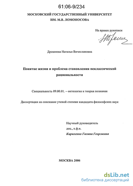 Таким образом, понятие жизни, особенно в русской философской традиции, исследовано недостаточно, а проблема влияния понятия жизни на становление неклассической рациональности и наличия разных подходов к образу неклассической рациональности еще не являлась предметом специального философского анализа.