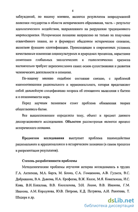 Все вышеизложенное определило тему, объект и предмет данного диссертационного исследования. Объектом рассмотрения является процесс исторического познания.