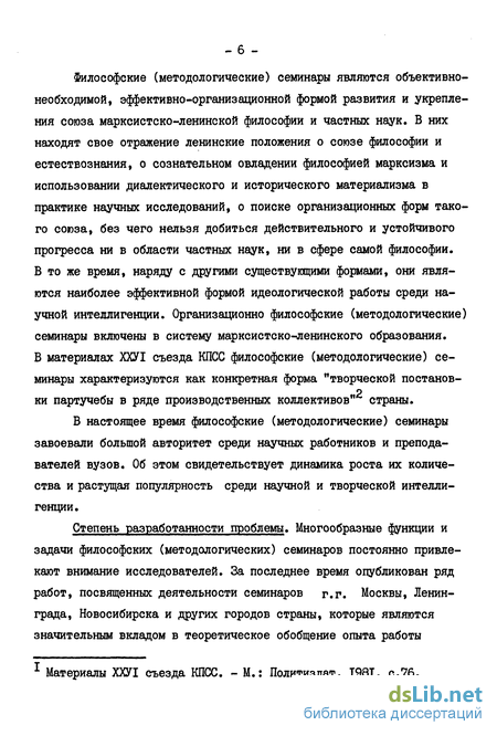 Степень разработанности проблемы. Многообразные функции и задачи философских (методологических) семинаров постоянно привлекают внимание исследователей. За последнее время опубликован ряд работ, посвященных деятельности семинаров г.г. Москвы, Ленинграда, Новосибирска и других городов страны, которые являются значительным вкладом в теоретическое обобщение опыта работы