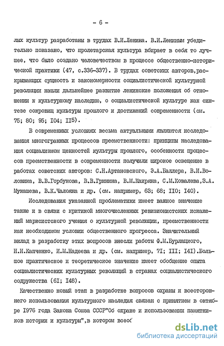 Для культурной революции как коренного переворота в сфере материального и духовного производства характерен не разрыв с культурой прошлого, а сохранение и использование достижений предшествующих этапов истории. Общие закономерности социалистической культурной революции, принципы наследования социализмом ценностей прош лых культур разработаны в трудах В.И.Ленина. В.И.Лениным убедительно показано, что пролетарская культура вбирает в себя то лучшее, что было создано человечеством в процессе общественно-исторической практики (47, с.336-337). В трудах советских авторов,раскрывающих сущность и закономерности социалистической культурной революции нашли дальнейшее развитие ленинские положения об отношении к культурному наследию, о социалистической культуре как синтезе сокровищ культуры прошлого и достижений современности (см. 75; 80; 95; 104; П5).