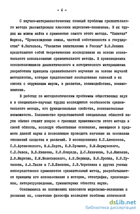 операции сравнения и сравнительного метода. В работах И.Д.Андреева, В.И.Бартона, С.И.Гончарука, Э.С.Маркаряна, Х.Н.Номджяна, М.М.Новоселова, А.М.Плотникова, Г.А.Подкорытова, И.Т.Фролова и других философов анализируются и разрабатываются проблемы, связанные с гносеологическими и методологическими аспектами этого способа исследования. На основе изучения специально-научного применения сравнительного метода философами ставятся вопросы.о его сущности, соотношении с диалектическим методом, соотношении теории и метода, специфики теоретических и эмпирических форм сравнения. Все эти работы вносят большой вклад в методологию общественного познания и содержат материалы, позволяющие обобщить имеющийся опыт сравнительного изучения общественных явлений в различных науках.
