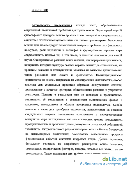 Актуальность исследования прежде всего, обуславливается современной постановкой проблемы критериев знания. Характерной чертой философского дискурса нашего времени стало смещение исследовательских акцентов с естественнонаучного знания на знание гуманитарное. Философия в наши дни демонстрирует повышенный интерес к проблематике фиктивных дискурсов, роли идеологии и неомифов в формировании картины мира современности, полагая их, в том числе, в качестве основания для самой науки. Одновременное развитие таких явлений, как виртуальная реальность, кибертекст, интернет-культура особым образом влияют на социальность, на процессы познания и коммуникации, указывая на взаимное проникновение таких феноменов как «текст» и «реальность». Постиндустриальное производство во многом направлено на моделирование «видимостей», особое значение для социальных процессов обретают дискурсивные явления, признаваемые в качестве критериев общественного развития и устройства реальности. Понятие о реальности уже не совпадает с традиционным пониманием её воплощения в совокупности эмпирических фактов и предметов, находящихся в области восприятия индивидуума. Особое значение в наши дни приобрели технологии, направленные на создание «виртуальных миров», заменяющие естественное и непосредственное восприятие мира нахождением вне его привычных границ, преодолением пространственных и временных рамок, выходом за рамки своей собственной телесности. Построение такого рода «иллюзорных опытов бытия» базируется на компьютерных технологиях, заменяющих естественные процессы формирования событий системой цифровых кодов. Данные практики, безусловно, основаны на потребности расширения опыта познания, преодоления эмпирических факторов, которые, казалось бы, влияют на его возможности. Такое положение дел требует более пристального изучения природы вымысла, иллюзии, фиктивных реальностей, обращения к их гносеологическому значению. Вымысел как практика познания существует тысячелетия, формируя культурные традиции и играя непосредственную роль в сфере коммуникации. Мы не преследуем цели - найти некое ультрасовременное видение проблемы вымысла, прежде всего - имеет смысл обобщить существующие позиции относительно воображаемых миров, с целью прояснения онтологического статуса и гносеологического значения последних. Вопрос об онтологическом статусе фиктивной реальности обнаруживает свою зависимость от понимания природы референции и обусловленности её экстралингвистическими факторами. В этом плане сама референция может быть представлена не как соответствие знака внешнему объекту мира, а как отождествление семиотической единицы с условиями её использования в пределах релевантных критериев употребления языковых выражений.