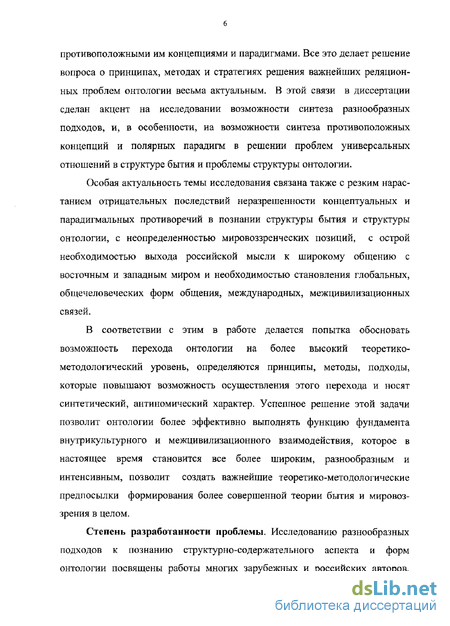 Актуальность темы исследования. В настоящей работе рассматриваются основные подходы к познанию структуры бытия и анализу структуры онтологии. Сочетание в работе этих двух направлений исследования, двух типов проблем обусловливается их взаимосвязью, Потребность в предпринимаемом исследовании вытекает: 1) из того кризисного состояния, которое переживает в настоящее время онтология и тех затруднений, с которыми она столкнулась, 2) из высокого статуса реляционных проблем (проблем отношений, проблем структуры) в современных онтологических исследованиях, 3) из современных интеграционных, интерактивных социо-культурных процессов, регионального и глобального характера. В этой связи, анализируя современные социо-культурные процессы и состояние философской мысли, В.С.Степин отмечает, что в настоящее время "потребность в философском осмыслении бытия ощущается, пожалуй, с особой остротой. Мы потеряли старые жизненные ориентиры и ищем новые. Но сразу их никто не откроет. То, что сейчас происходит в культуре, в наших поисках и дискуссиях, во многом связано с попытками создать элементы и структуры нового мировидения". Важнейшей предпосылкой повышения результативности таких поисков и попыток является определение эффективных подходов, методов решения как мировоззренческих, онтологических проблем, вообще, так и реляционных онтологических проблем, в частности.