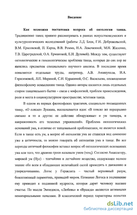 Традиционно танец принято рассматривать в рамках искусствоведческих и культурологических исследований (работы Л.Д. Блок, Г.Н. Добровольской, В,М. Красовской, П. Карпа, В.В. Ромма, Н.А. Левочкиной, М.Н. Жиленко, Т.В. Цареградской, О.А. Ермаковой, Е.И. Дуловой). Между тем, существуют онтологические и гносеологические проблемы танца, которые до сих пор не являлись предметом специального научного анализа. В последнее время появляются отдельные труды, например, А.В. Амашукели, И.А. Герасимовой, Л.П. Мориной, С.Н. Куракиной, О.С. Васильева, посвященные философскому осмыслению танца. Однако авторы касаются лишь отдельных сторон танцевального бытия - связи с мифологией, проблем происхождения, роли и места в социокультурном пространстве, эстетики танца.