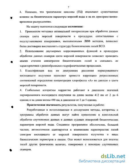 Практическая значимость результатов, полученных в работе: Разработанные и использованные в диссертации методы, алгоритмы и программы обработки данных могут найти применение в комплексной обработке спутниковых данных и данных судовых измерений биооптических параметров морской воды. Созданное программное обеспечение, большей частью, автоматически адаптируется к изменениям характеристик полей спектров восходящего от морской поверхности излучения и иных биооптических параметров в океане. Оно может использоваться для анализа полей других физических величин, измеряемых с помощью спутниковых сканеров.