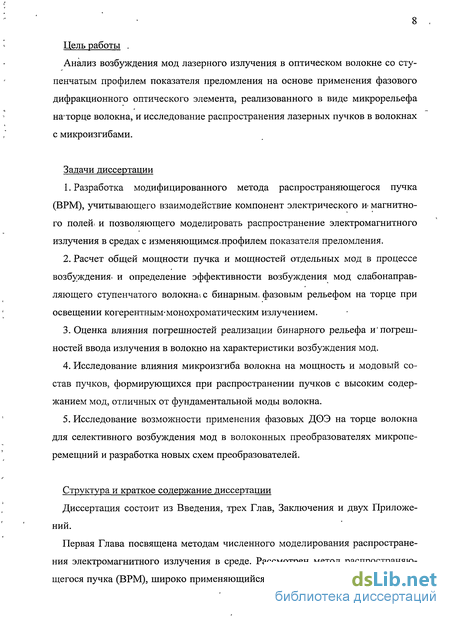 Задачи диссертации 1. Разработка модифицированного метода распространяющегося пучка (ВРМ), учитывающего взаимодействие компонент электрического н магнитного полей и позволяющего моделировать распространение электромагнитного излучения в средах с изменяющимся.профилем показателя преломления. 2. Расчет общей мощности пучка и мощностей отдельных мод в процессе возбуждения, и определение эффективности возбуждения мод слабонаправляющего ступенчатого волокна-, с бинарным, фазовым рельефом на торце при освещении когерентным-монохроматическим излучением. 3. Оценка влияния погрешностей реализации бинарного рельефа и погрешностей ввода излучения в волокно на характеристики возбуждения мод. 4. Исследование влияния микроизгиба волокна на мощность и модовый состав пучков, формирующихся при распространении пучков с высоким содержанием мод, отличных от фундаментальной моды волокна. 5. Исследование возможности применения фазовых ДОЭ на торце волокна для селективного возбуждения мод в волоконных преобразователях микропе-ремещний и разработка новых схем преобразователей. Структура и краткое содержание диссертации Диссертация состоит из Введения, трех Глав, Заключения и двух Приложений. Первая Глава посвящена методам численного моделирования распространения электромагнитного излучения в среде. Рассмотрен метод распространяющегося пучка (ВРМ), широко применяющийся для моделирования в интегральной и волоконной оптике, продемонстрированы ограничения его применимости. Показано, что одним из основных недостатков метода ВРМ является требование неизменности профиля показателя преломления в направлении распространения, которое при решении практических задач не всегда удовлетворяется. На основе анализа используемой в методе математической модели распространения излучения в среде, а также накладываемых в рамках этой модели ограничений, предложена модификация модели и метода, позволяющая проводить численное моделирование для общего случая изменяющегося профиля показателя преломления.