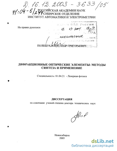 Личный вклад. Диссертация является обобщением исследований по созданию методов и устройств для изготовления дифракционной оптики, выполненных автором в ИАиЭ СО РАН с 1973 г. по настоящее время. Практическая реализация ДОЭ выполнялась автором на лазерной записывающей системе созданной в ИАиЭ СО РАН совместно с